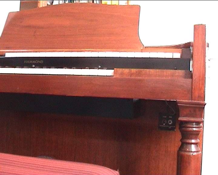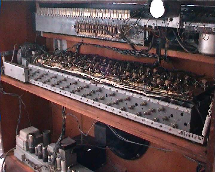 Még nem kapcsoltam be ilyen jószágot. Kis keresés után jobboldalt a billentyuzet alatt találom meg a kapcsolópárt. Olvasom: Baloldalit felnyomni, nyolcig számolni. Némi zaj után felpörgést hallok. (indítómotor) Nyolc után a jobboldali kapcsolót felkapcsolni, de a balt még négyig tartani. Még egy, de finomabb felpörgési hang. (hanggenerátor) Utána alig hallható surrogás. Semmi kerregés, remegés. Azt hittem pedig hogy ez a Hammondokkal együtt jár. Azután megszólalt a 12"-os hangszóró tisztán, és igen hangosan. Szép csöves hang.